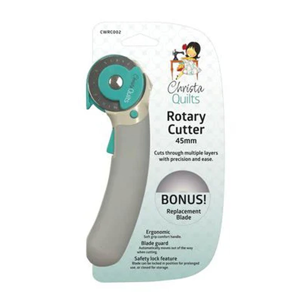 This ergonomic rotary cutter features a soft comfort handle, blade guard and safety lock feature. It can stand up when not in use and can be locked in the open or closed position. It uses all standard 45 mm replacement blades.